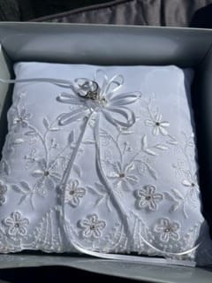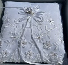 White ring cushion with embroidered flowers and diamantes, wedding bands can be tied onto the main flower which wont come off if a flower girl or pageboy are carrying the cushion.
